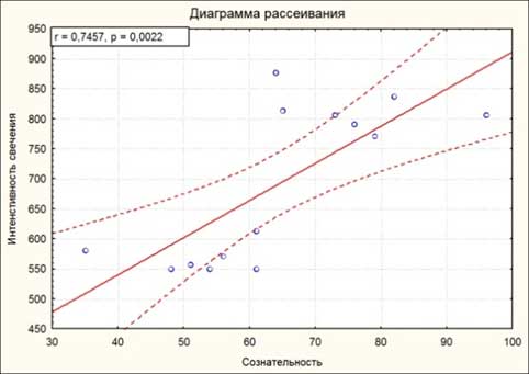 Рассматривая проведенный корреляционный анализ, мы можем увидеть некоторые закономерности. Существует достаточно высокий коэффициент корреляции между показателями сознательности и интенсивности свечения (r = 0,7457 - сильный показатель корреляции), и показателями доброжелательности и площадью засветки (r = 0, 6313 - средний показатель).