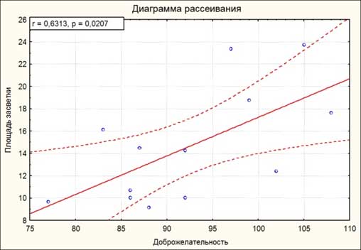 Для подтверждения истинности выявленных связей мы строили, так называемые, диаграммы рассеивания, которые являются стандартной графической формой представления результатов корреляционного анализа.