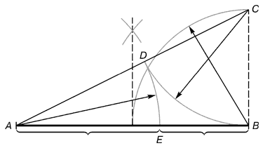 Из точки В восставляется перпендикуляр, равный половине АВ. Полученная точка С соединяется линией с точкой А. На полученной линии откладывается отрезок ВС, заканчивающийся точкой D. Отрезок AD переносится на прямую АВ. Полученная при этом точка Е делит отрезок АВ в соотношении золотой пропорции.