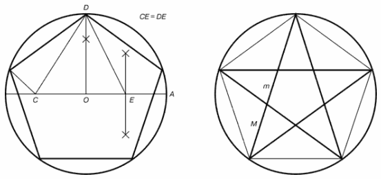 Для построения пентаграммы необходимо построить правильный пятиугольник. Способ его построения разработал немецкий живописец и график Альбрехт Дюрер (1471...1528). Пусть O - центр окружности, A - точка на окружности и Е - середина отрезка ОА. Перпендикуляр к радиусу ОА, восставленный в точке О, пересекается с окружностью в точке D. Пользуясь циркулем, отложим на диаметре отрезок CE = ED. Длина стороны вписанного в окружность правильного пятиугольника равна DC. Откладываем на окружности отрезки DC и получим пять точек для начертания правильного пятиугольника. Соединяем углы пятиугольника через один диагоналями и получаем пентаграмму. Все диагонали пятиугольника делят друг друга на отрезки, связанные между собой золотой пропорцией.